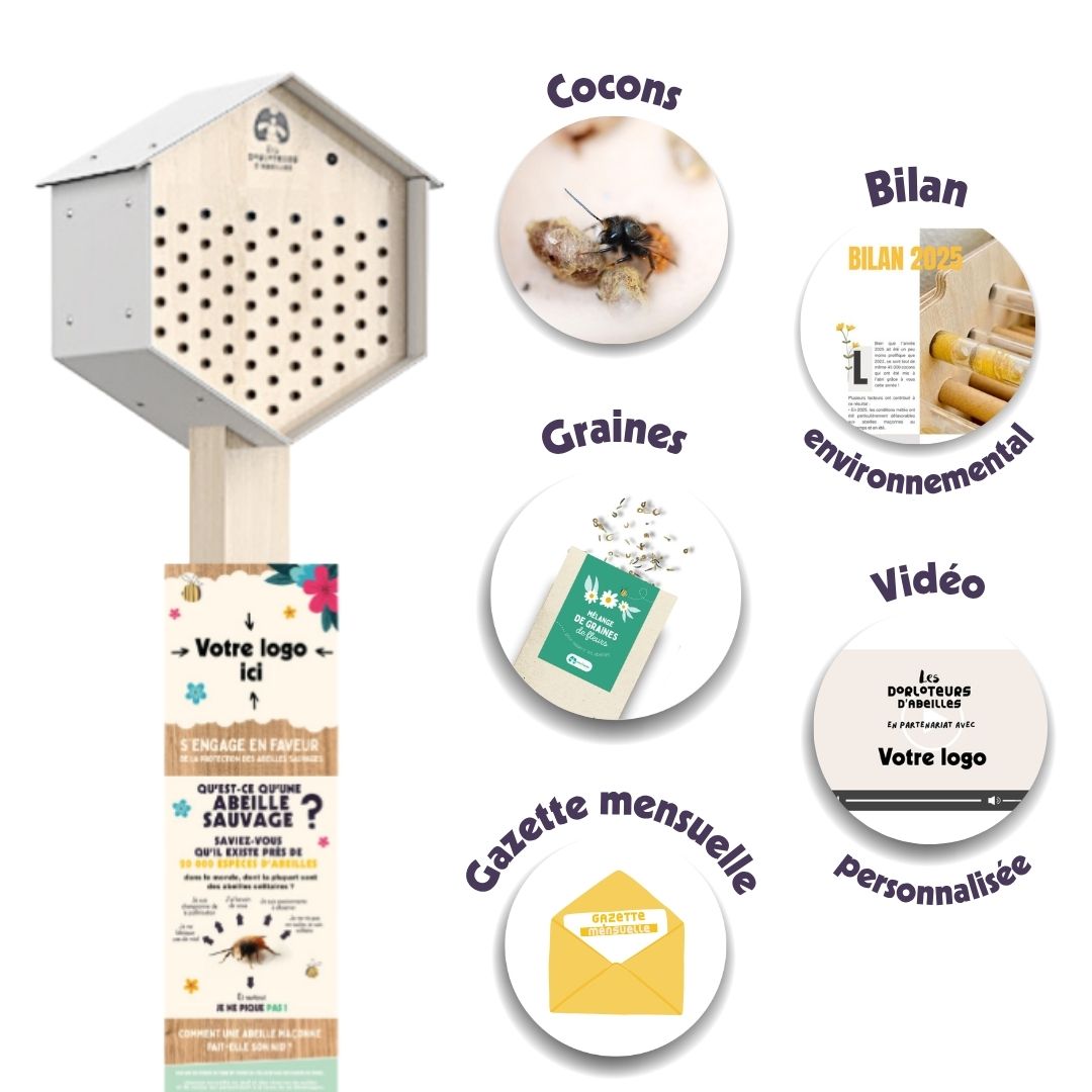 Cet abri à abeilles solitaires offrira un abri aux abeilles sauvages. Ces petites butineuses ne vivent pas en colonie, ne fabriquent pas de miel et ne piquent pas. Les tubes d’observation transparents permettent une observation des abeilles sauvages tout au long de leur cycle. Le panneau présente les abeilles sauvages qui peuvent s’installer dans le Dorlotoir, comment les observer, comment elles font leur nid, etc. Fixez-le directement sur le pied du Dorlotoir ! Vous pouvez personnaliser votre panneau avec votre logo.